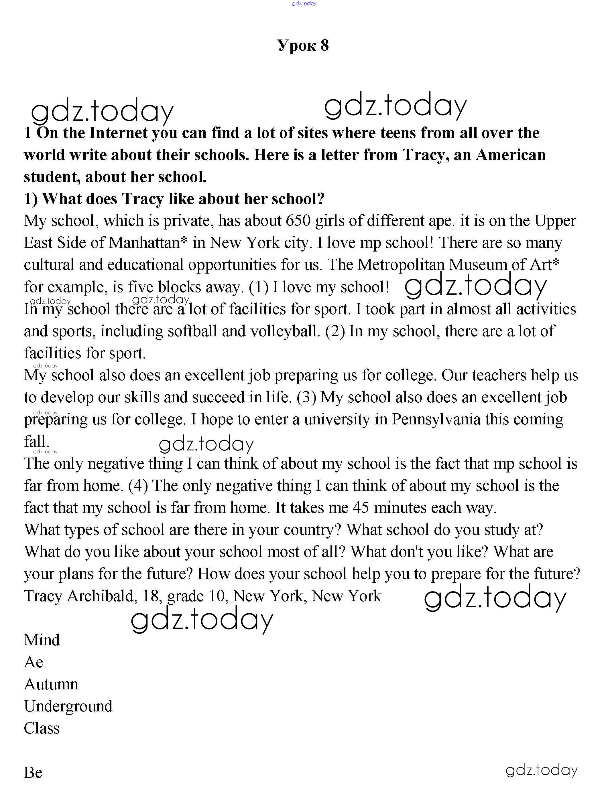 На страницах сайта gdz.today вы найдете учебный и вспомогательный материал, направленный на улучшения знаний школьной программы. ГДЗ - онлайн мир знаний Урок 8 Решение к Unit 4. What school do you go to? 1 Учебнику по Английскому языку для 9 класса Кузовлев, Лапа Просвещение УМК 2015