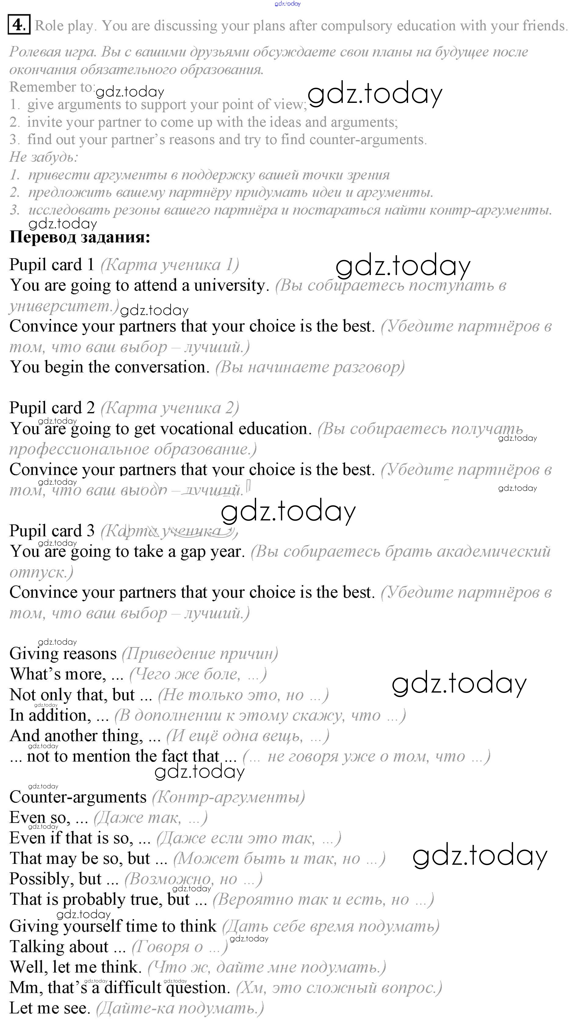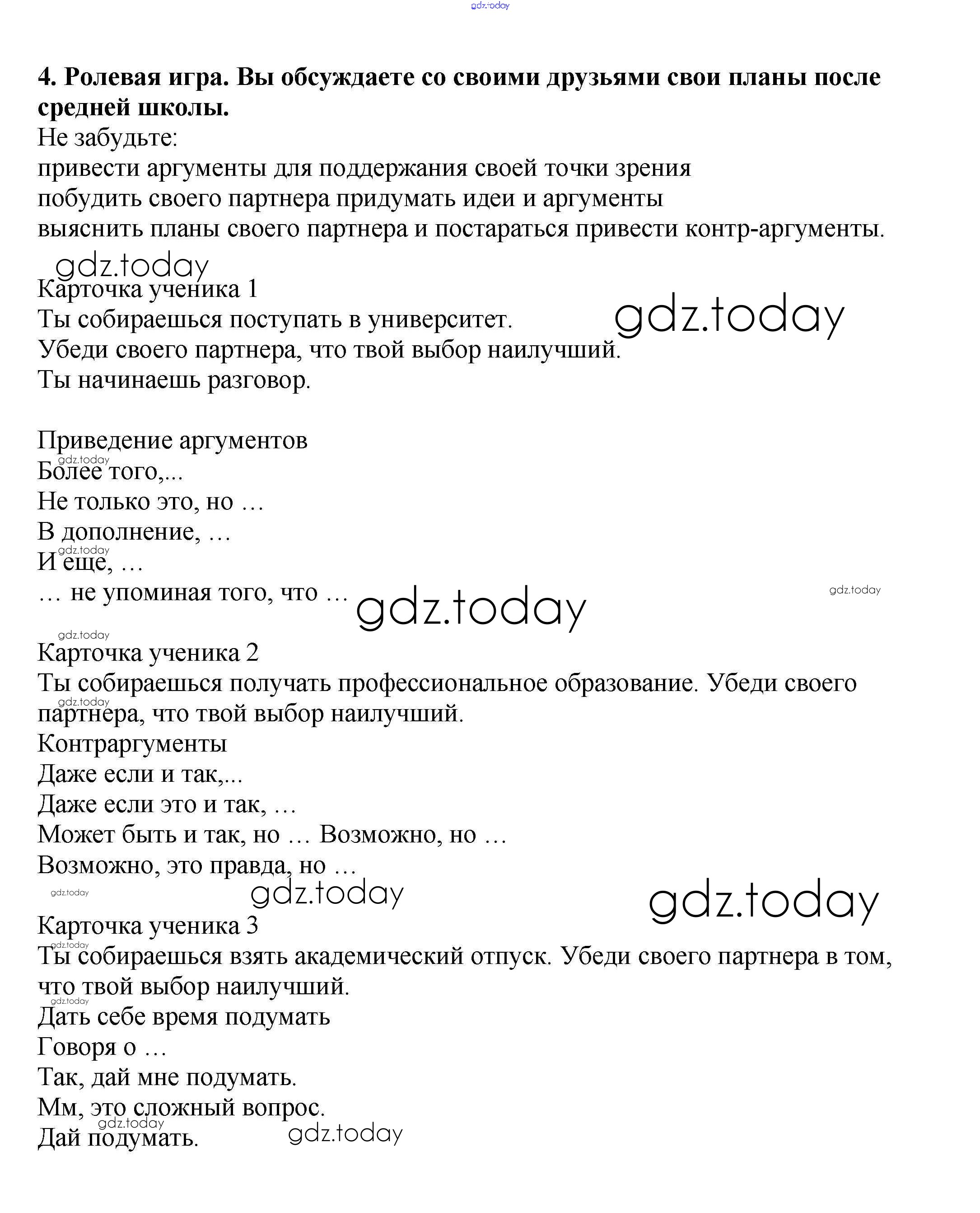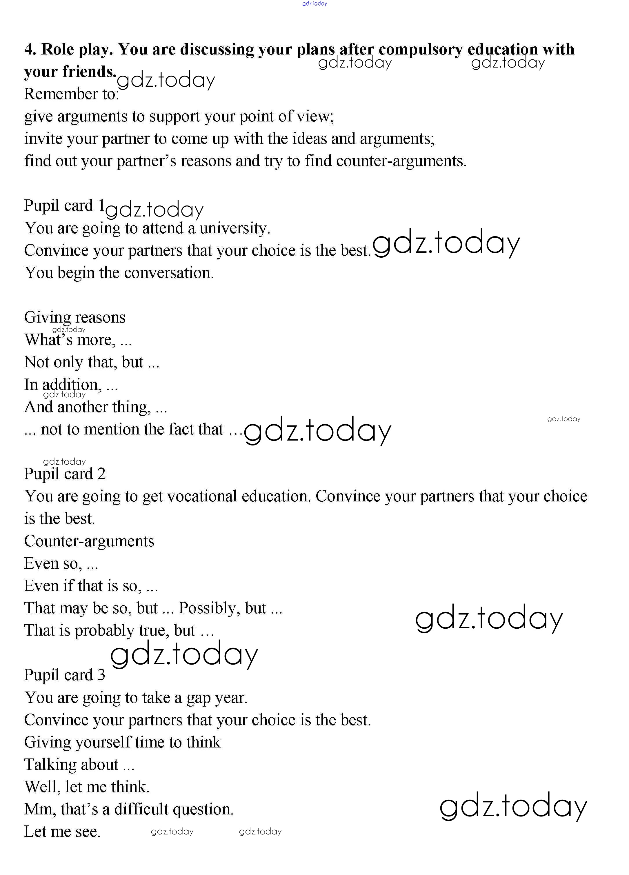 На страницах сайта gdz.today вы найдете учебный и вспомогательный материал, направленный на улучшения знаний школьной программы. ГДЗ - онлайн мир знаний Урок 8 Решение к Unit 5. School — what's next? 4 Учебнику по Английскому языку для 9 класса Кузовлев, Лапа Просвещение УМК 2015