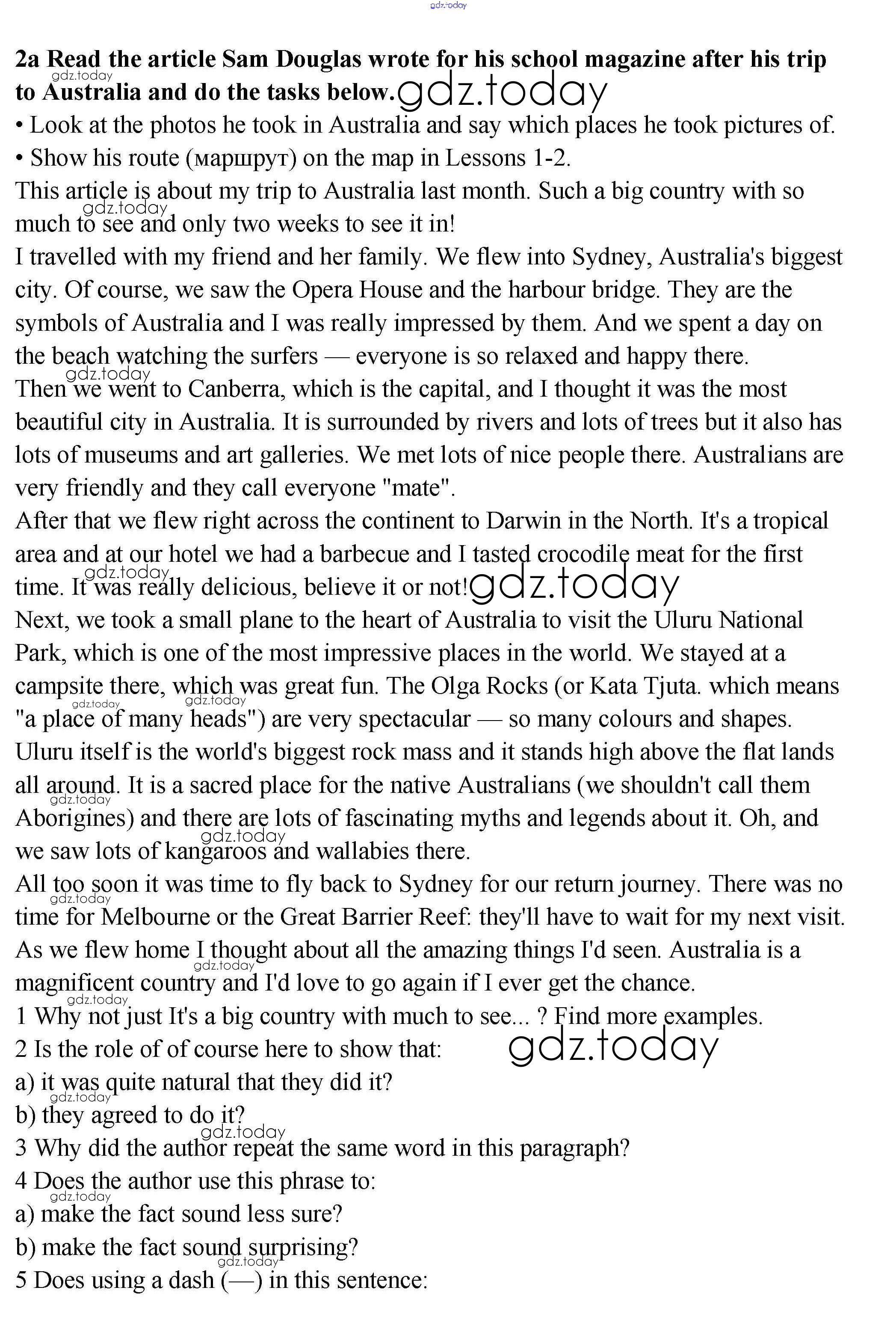 На страницах сайта gdz.today вы найдете учебный и вспомогательный материал, направленный на улучшения знаний школьной программы. ГДЗ - онлайн мир знаний Lesson 6 Решение к Unit 5. Let's travel Australia! 2a Учебнику по Английскому языку для 9 класса Гроза, Дворецкая Титул New Millennium 2010