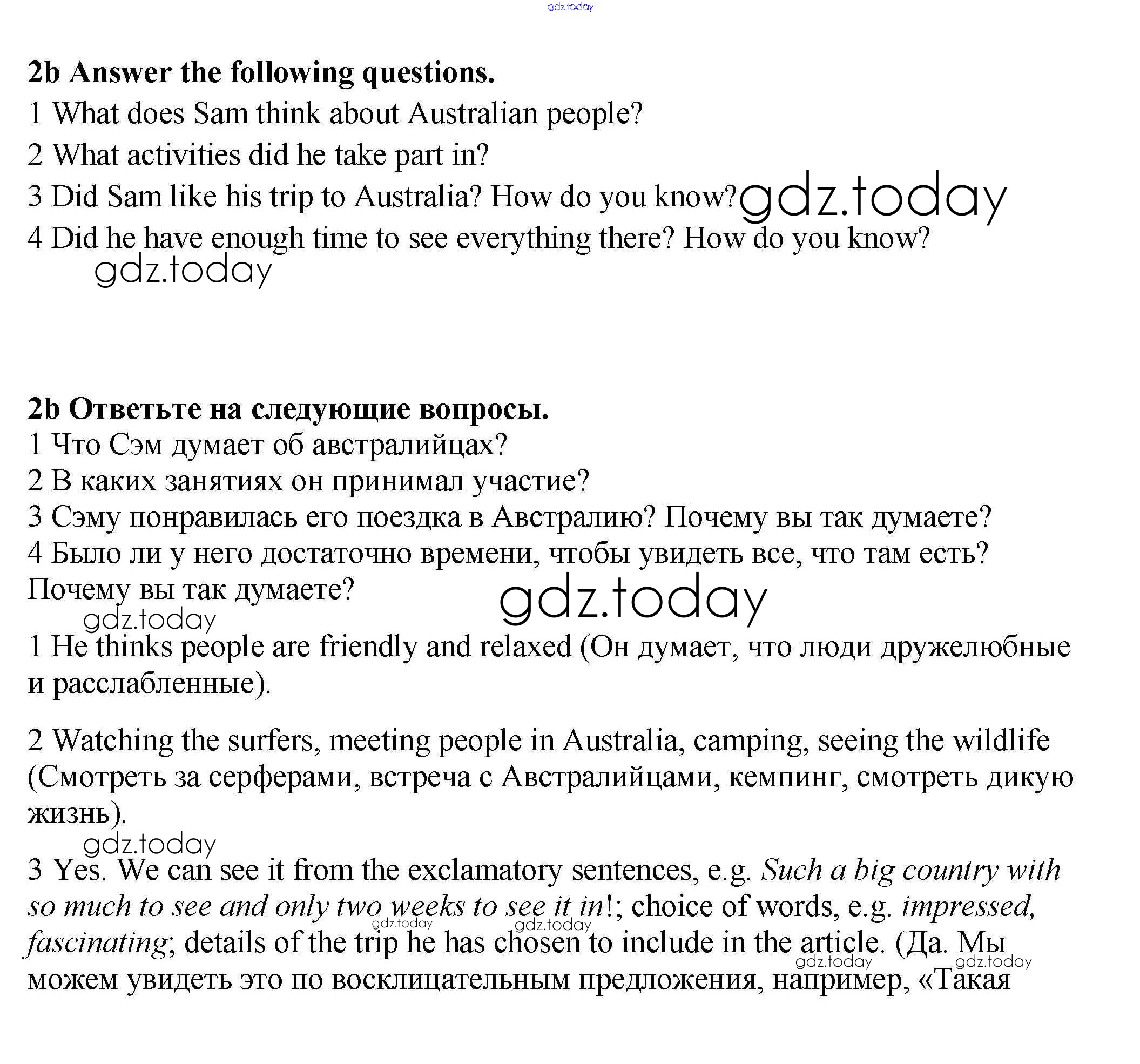 На страницах сайта gdz.today вы найдете учебный и вспомогательный материал, направленный на улучшения знаний школьной программы. ГДЗ - онлайн мир знаний Lesson 6 Решение к Unit 5. Let's travel Australia! 2b Учебнику по Английскому языку для 9 класса Гроза, Дворецкая Титул New Millennium 2010