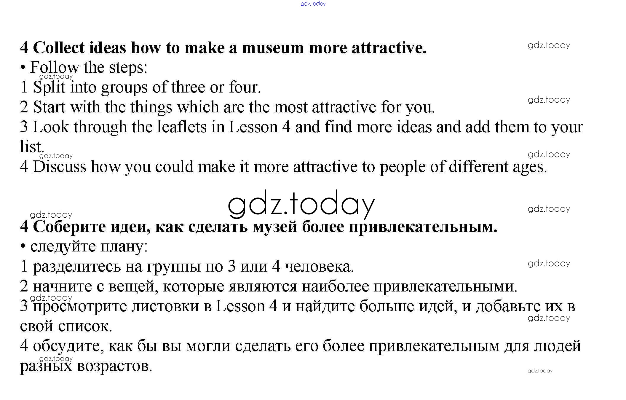 На страницах сайта gdz.today вы найдете учебный и вспомогательный материал, направленный на улучшения знаний школьной программы. ГДЗ - онлайн мир знаний Lesson 5-6 Решение к Unit 8. Making your day out fun 4 Учебнику по Английскому языку для 9 класса Гроза, Дворецкая Титул New Millennium 2010