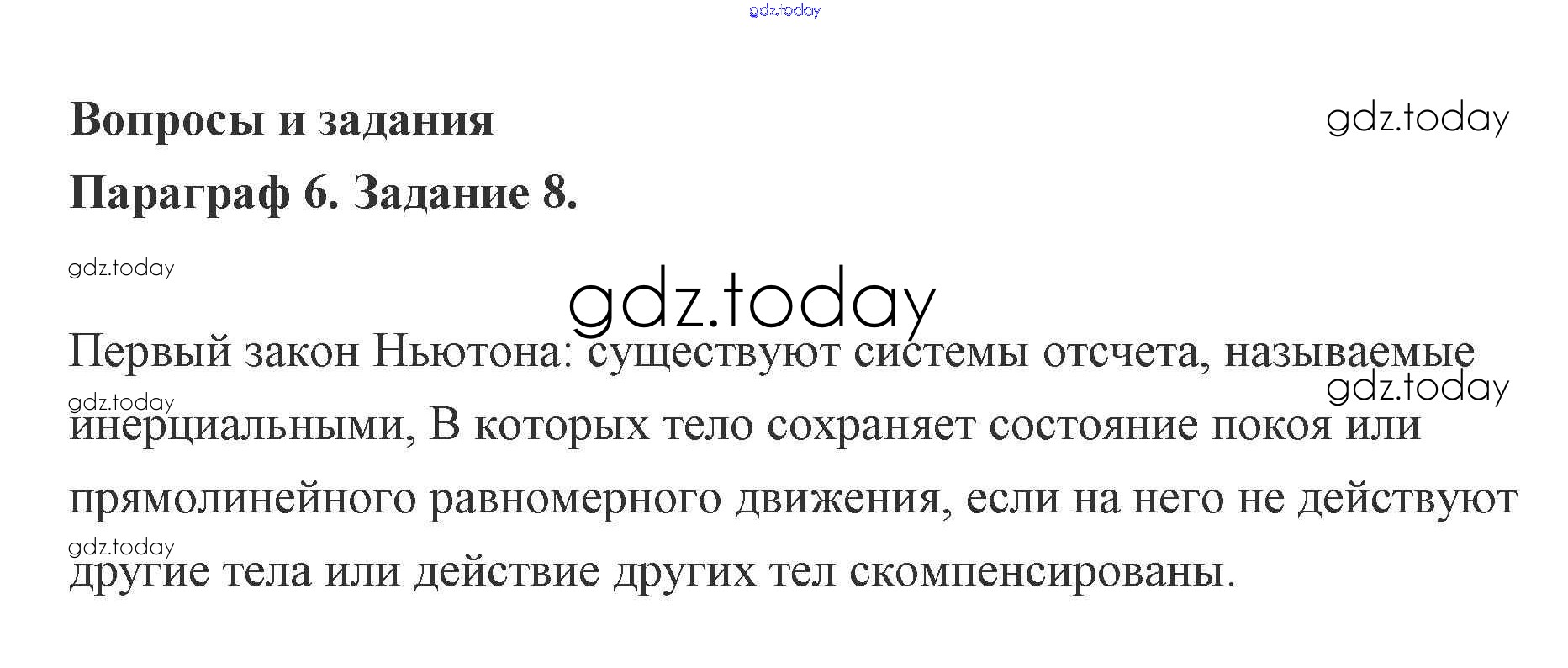 На страницах сайта gdz.today вы найдете учебный и вспомогательный материал, направленный на улучшения знаний школьной программы. ГДЗ - онлайн мир знаний Задание 6. Закон инерции - первый закон Ньютона 8 Учебнику по Физике для 9 класса Генденштейн, Булатова Мнемозина 2010
