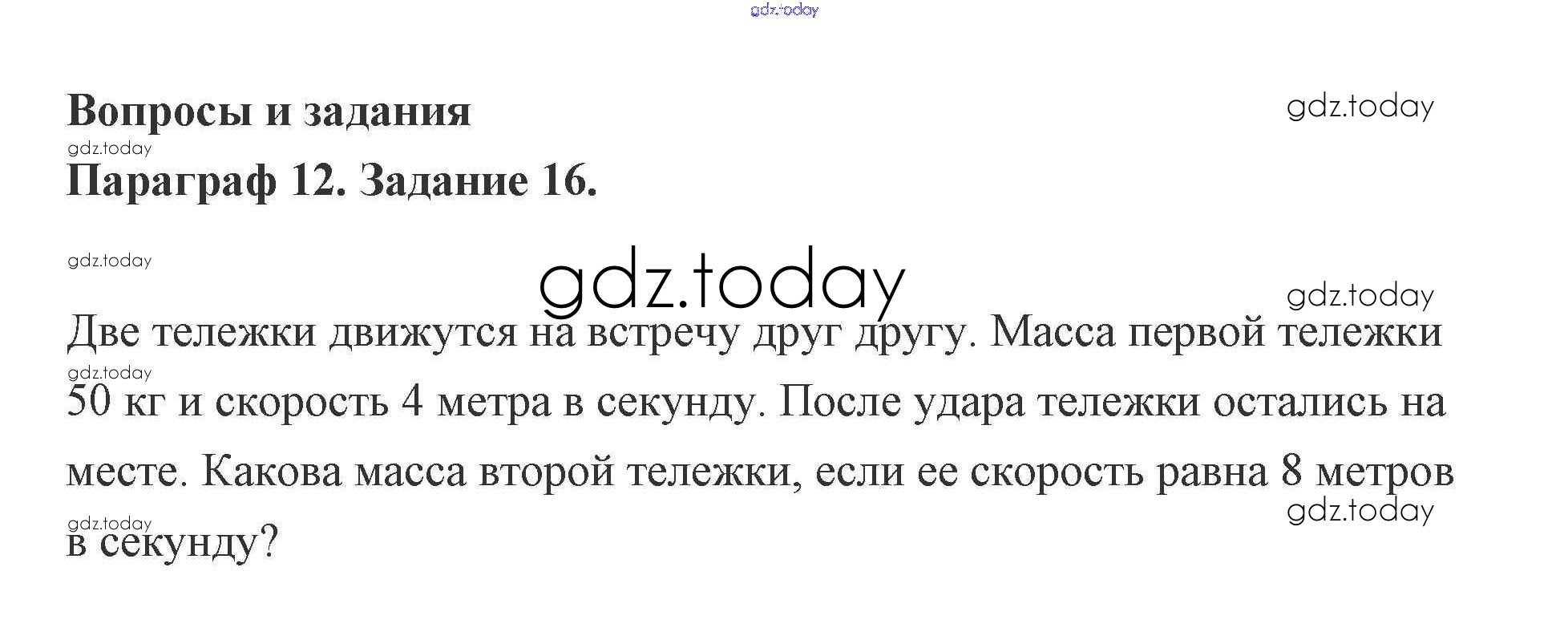 На страницах сайта gdz.today вы найдете учебный и вспомогательный материал, направленный на улучшения знаний школьной программы. ГДЗ - онлайн мир знаний Задание 12. Импульс. Закон сохранения импульса 16 Учебнику по Физике для 9 класса Генденштейн, Булатова Мнемозина 2010