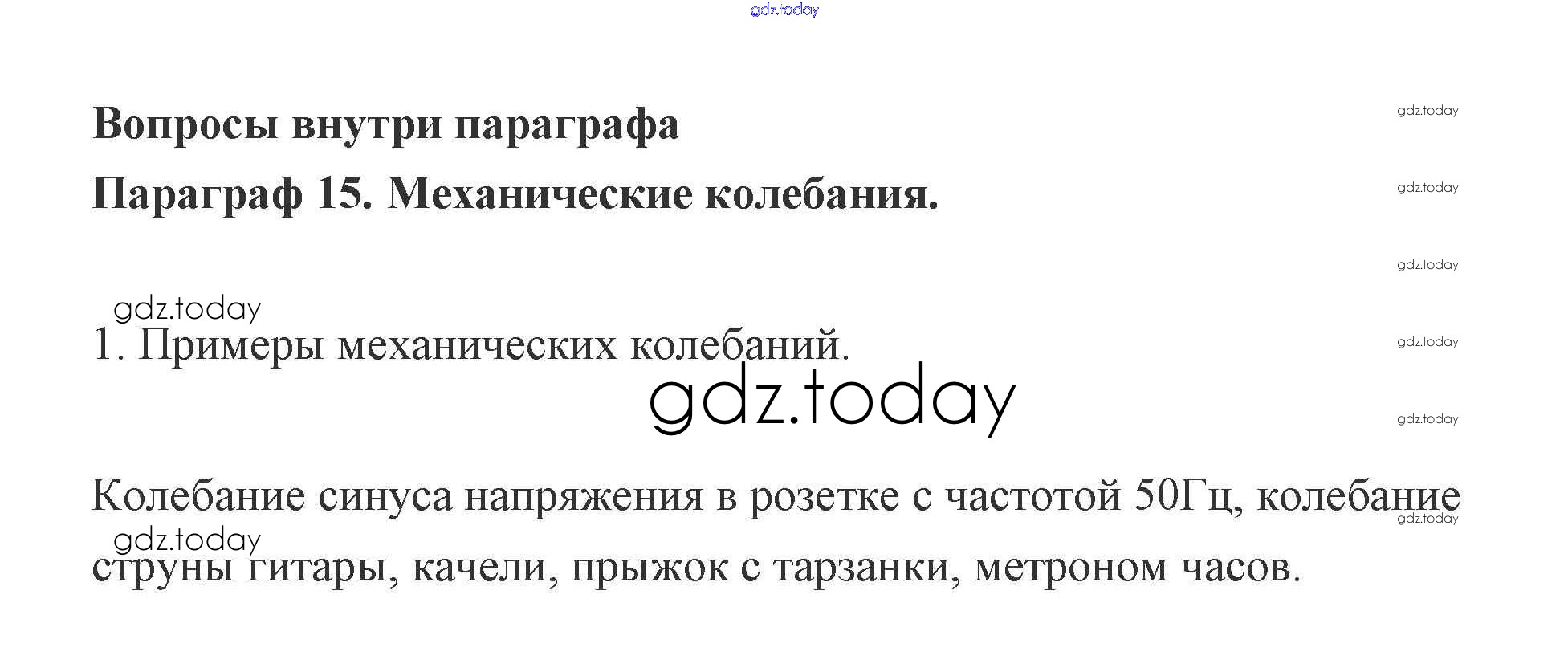 На страницах сайта gdz.today вы найдете учебный и вспомогательный материал, направленный на улучшения знаний школьной программы. ГДЗ - онлайн мир знаний Вопросы 15. Механические колебания 1 Учебнику по Физике для 9 класса Генденштейн, Булатова Мнемозина 2010