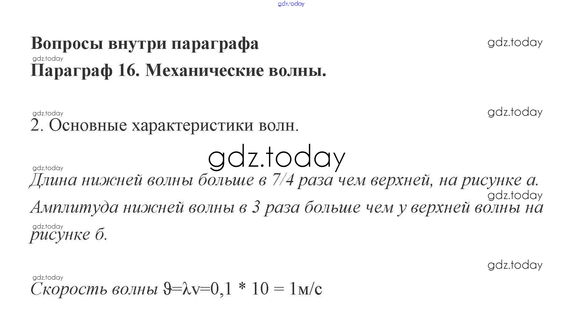 На страницах сайта gdz.today вы найдете учебный и вспомогательный материал, направленный на улучшения знаний школьной программы. ГДЗ - онлайн мир знаний Вопросы 16. Механические волны 2 Учебнику по Физике для 9 класса Генденштейн, Булатова Мнемозина 2010