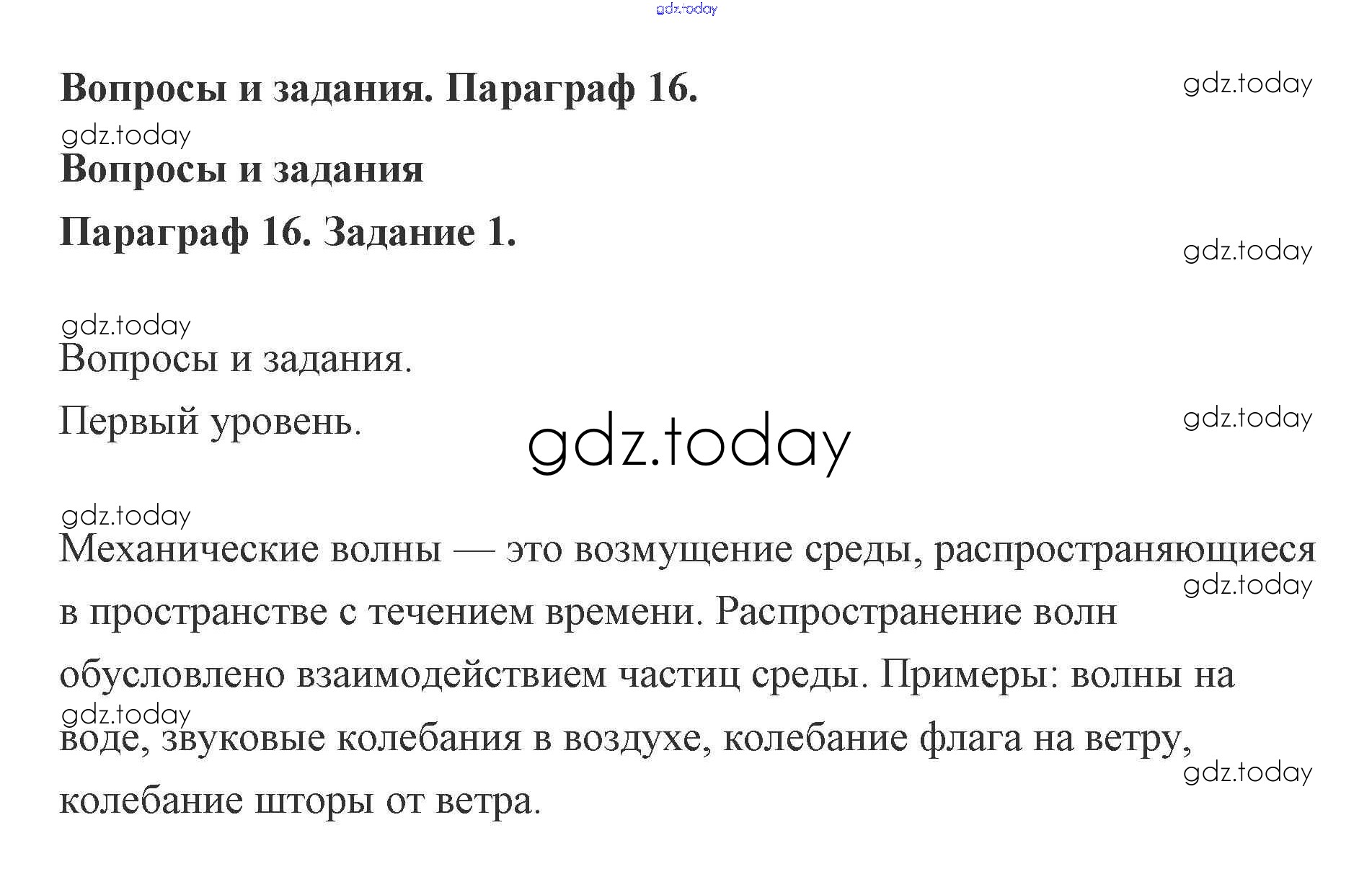 На страницах сайта gdz.today вы найдете учебный и вспомогательный материал, направленный на улучшения знаний школьной программы. ГДЗ - онлайн мир знаний Задание 16. Механические волны 1 Учебнику по Физике для 9 класса Генденштейн, Булатова Мнемозина 2010