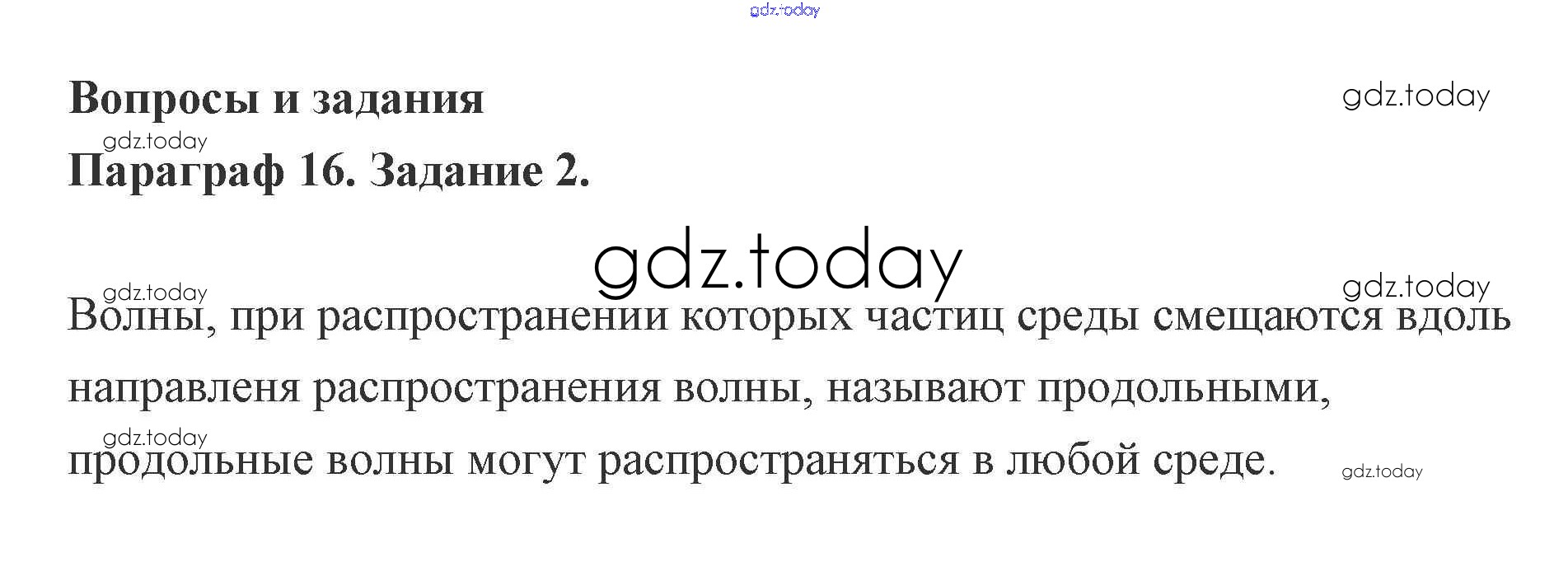 На страницах сайта gdz.today вы найдете учебный и вспомогательный материал, направленный на улучшения знаний школьной программы. ГДЗ - онлайн мир знаний Задание 16. Механические волны 2 Учебнику по Физике для 9 класса Генденштейн, Булатова Мнемозина 2010