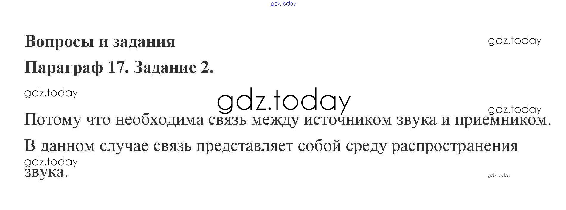 На страницах сайта gdz.today вы найдете учебный и вспомогательный материал, направленный на улучшения знаний школьной программы. ГДЗ - онлайн мир знаний Задание 17. Звук 2 Учебнику по Физике для 9 класса Генденштейн, Булатова Мнемозина 2010