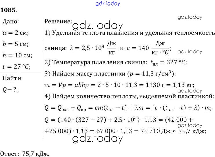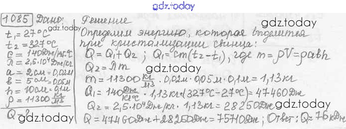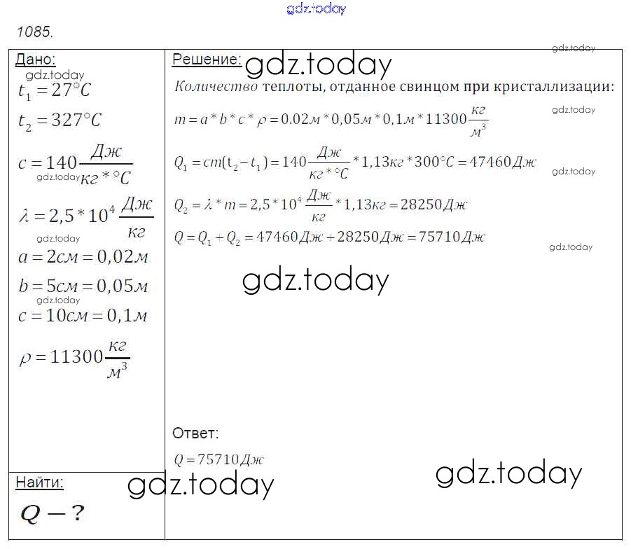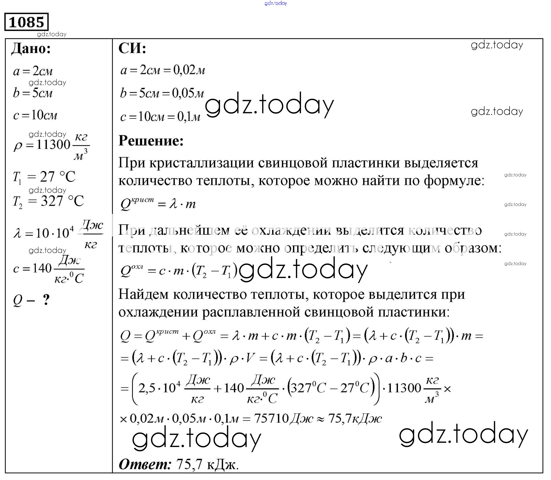 На страницах сайта gdz.today вы найдете учебный и вспомогательный материал, направленный на улучшения знаний школьной программы. ГДЗ - онлайн мир знаний Решение к заданиям 1085 Сборнику задач по Физике для 7-9 класса Лукашик, Иванова Просвещение 2011