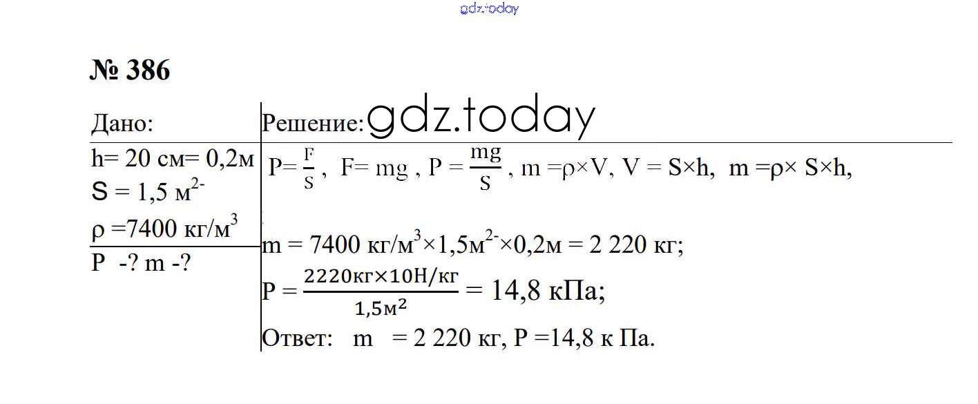 Ответы к Давление твердых тел, жидкостей и газов Решение. 7 класс 386 Сборнику задач по Физике для 7-9 класса Перышкин, Лонцова Экзамен УМК 2016