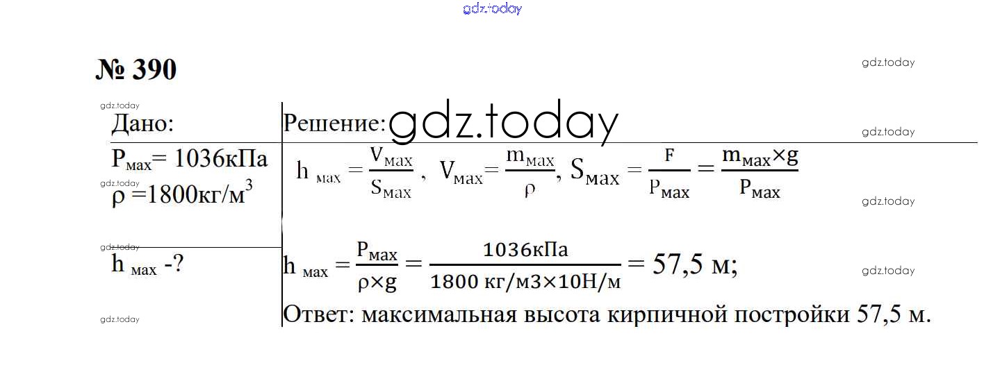 На страницах сайта gdz.today вы найдете учебный и вспомогательный материал, направленный на улучшения знаний школьной программы. ГДЗ - онлайн мир знаний Давление твердых тел, жидкостей и газов Решение. 7 класс 390 Сборнику задач по Физике для 7-9 класса Перышкин, Лонцова Экзамен УМК 2016