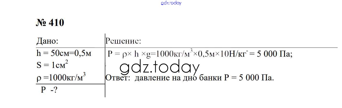 На страницах сайта gdz.today вы найдете учебный и вспомогательный материал, направленный на улучшения знаний школьной программы. ГДЗ - онлайн мир знаний Давление твердых тел, жидкостей и газов Решение. 7 класс 410 Сборнику задач по Физике для 7-9 класса Перышкин, Лонцова Экзамен УМК 2016