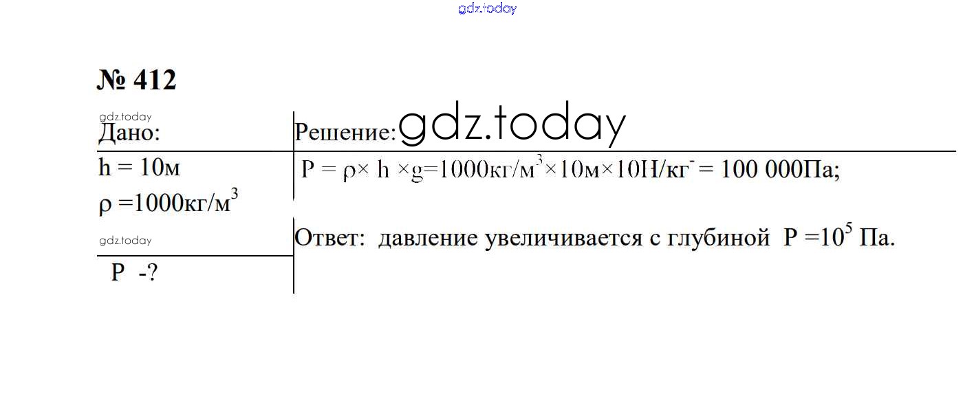 На страницах сайта gdz.today вы найдете учебный и вспомогательный материал, направленный на улучшения знаний школьной программы. ГДЗ - онлайн мир знаний Давление твердых тел, жидкостей и газов Решение. 7 класс 412 Сборнику задач по Физике для 7-9 класса Перышкин, Лонцова Экзамен УМК 2016