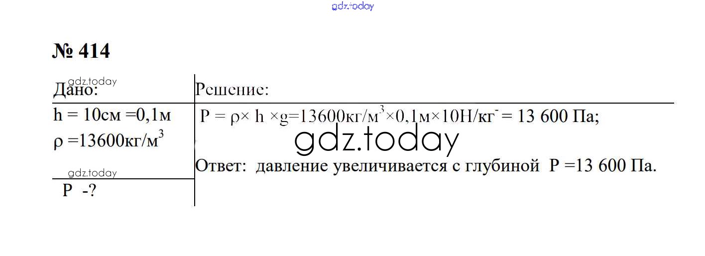 На страницах сайта gdz.today вы найдете учебный и вспомогательный материал, направленный на улучшения знаний школьной программы. ГДЗ - онлайн мир знаний Давление твердых тел, жидкостей и газов Решение. 7 класс 414 Сборнику задач по Физике для 7-9 класса Перышкин, Лонцова Экзамен УМК 2016