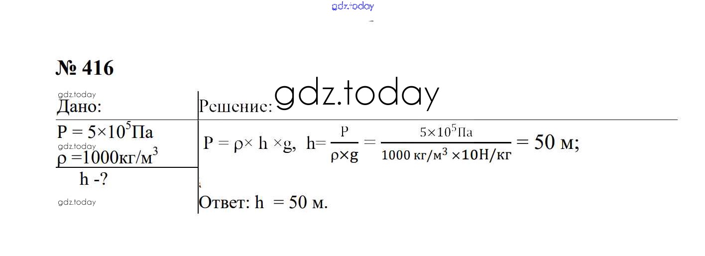 На страницах сайта gdz.today вы найдете учебный и вспомогательный материал, направленный на улучшения знаний школьной программы. ГДЗ - онлайн мир знаний Давление твердых тел, жидкостей и газов Решение. 7 класс 416 Сборнику задач по Физике для 7-9 класса Перышкин, Лонцова Экзамен УМК 2016