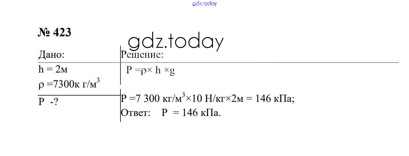 На страницах сайта gdz.today вы найдете учебный и вспомогательный материал, направленный на улучшения знаний школьной программы. ГДЗ - онлайн мир знаний Давление твердых тел, жидкостей и газов Решение. 7 класс 423 Сборнику задач по Физике для 7-9 класса Перышкин, Лонцова Экзамен УМК 2016