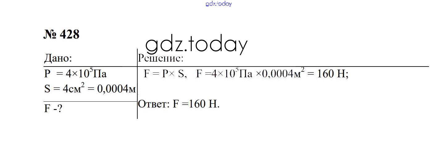 На страницах сайта gdz.today вы найдете учебный и вспомогательный материал, направленный на улучшения знаний школьной программы. ГДЗ - онлайн мир знаний Давление твердых тел, жидкостей и газов Решение. 7 класс 428 Сборнику задач по Физике для 7-9 класса Перышкин, Лонцова Экзамен УМК 2016