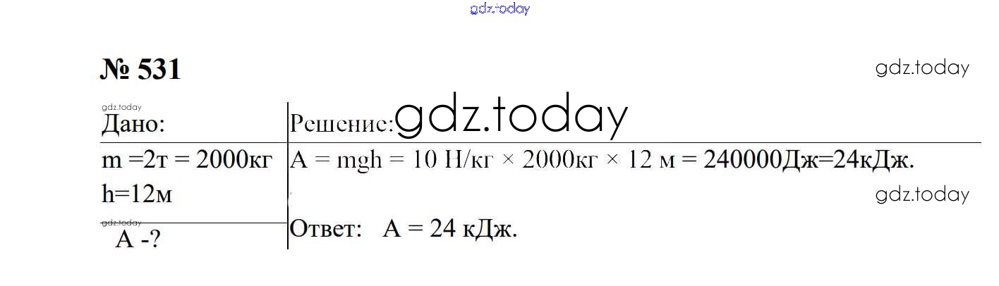 На страницах сайта gdz.today вы найдете учебный и вспомогательный материал, направленный на улучшения знаний школьной программы. ГДЗ - онлайн мир знаний Работа и мощность. Энергия Решение. 7 класс 531 Сборнику задач по Физике для 7-9 класса Перышкин, Лонцова Экзамен УМК 2016