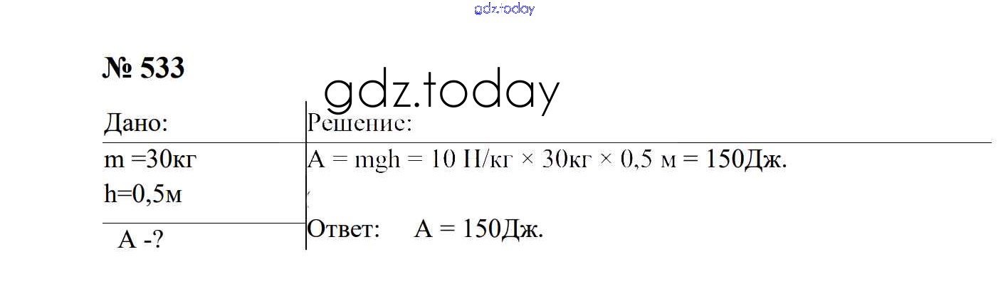 На страницах сайта gdz.today вы найдете учебный и вспомогательный материал, направленный на улучшения знаний школьной программы. ГДЗ - онлайн мир знаний Работа и мощность. Энергия Решение. 7 класс 533 Сборнику задач по Физике для 7-9 класса Перышкин, Лонцова Экзамен УМК 2016
