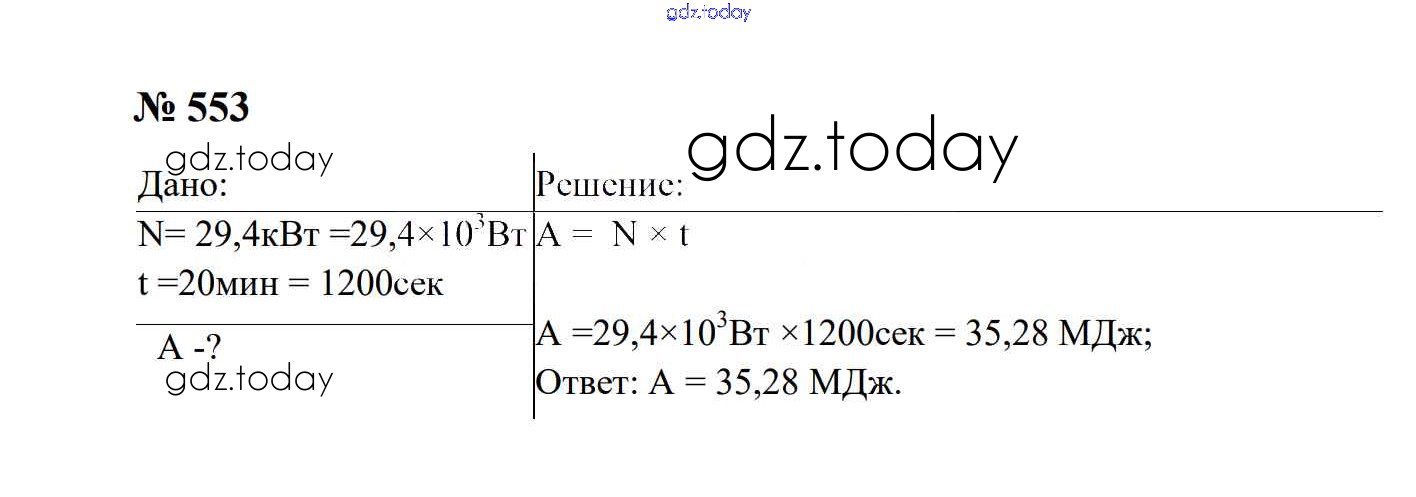 На страницах сайта gdz.today вы найдете учебный и вспомогательный материал, направленный на улучшения знаний школьной программы. ГДЗ - онлайн мир знаний Работа и мощность. Энергия Решение. 7 класс 553 Сборнику задач по Физике для 7-9 класса Перышкин, Лонцова Экзамен УМК 2016