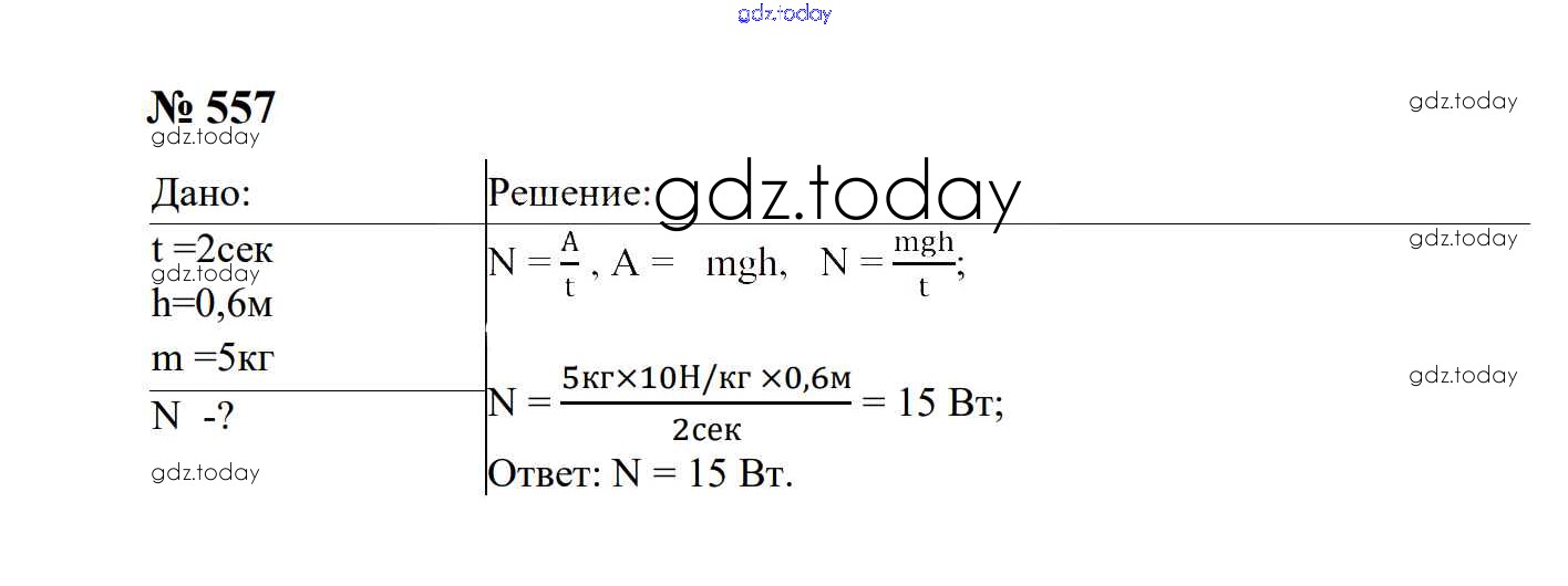На страницах сайта gdz.today вы найдете учебный и вспомогательный материал, направленный на улучшения знаний школьной программы. ГДЗ - онлайн мир знаний Работа и мощность. Энергия Решение. 7 класс 557 Сборнику задач по Физике для 7-9 класса Перышкин, Лонцова Экзамен УМК 2016