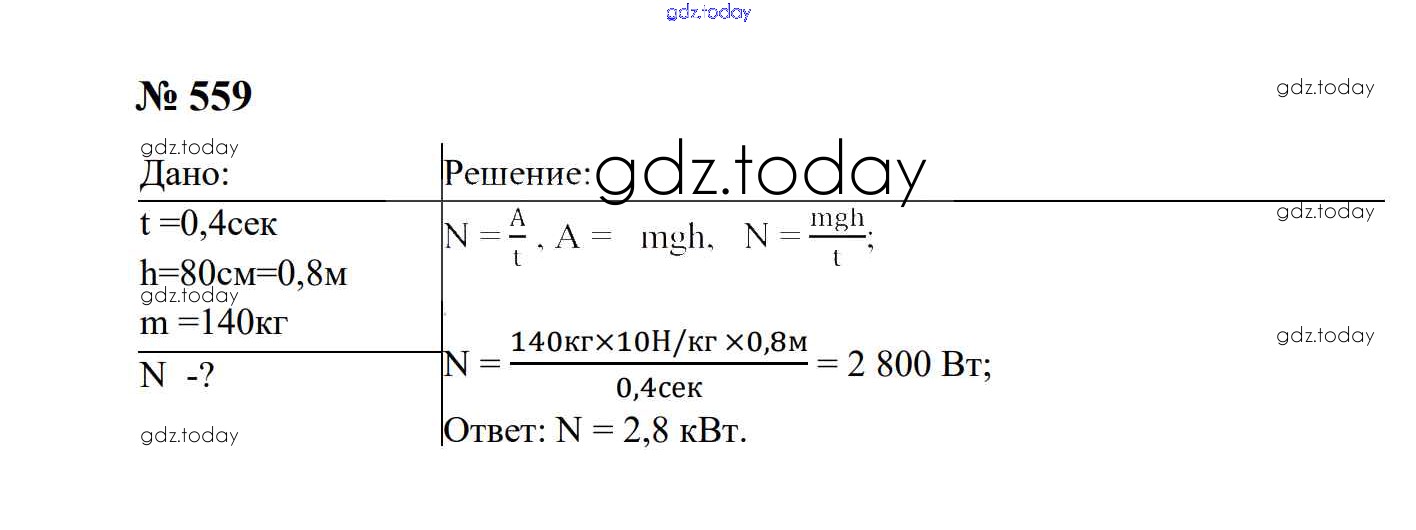 На страницах сайта gdz.today вы найдете учебный и вспомогательный материал, направленный на улучшения знаний школьной программы. ГДЗ - онлайн мир знаний Работа и мощность. Энергия Решение. 7 класс 559 Сборнику задач по Физике для 7-9 класса Перышкин, Лонцова Экзамен УМК 2016