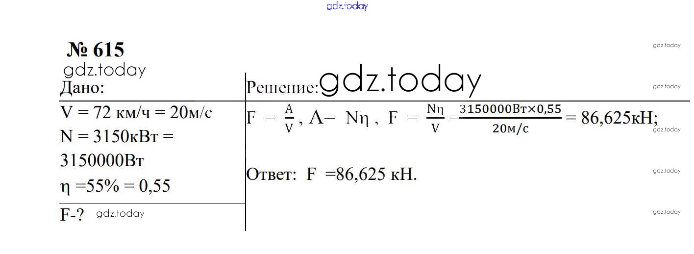 На страницах сайта gdz.today вы найдете учебный и вспомогательный материал, направленный на улучшения знаний школьной программы. ГДЗ - онлайн мир знаний Работа и мощность. Энергия Решение. 7 класс 615 Сборнику задач по Физике для 7-9 класса Перышкин, Лонцова Экзамен УМК 2016