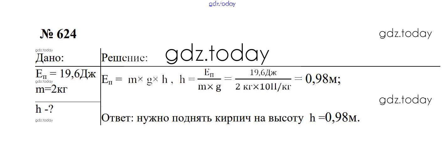 На страницах сайта gdz.today вы найдете учебный и вспомогательный материал, направленный на улучшения знаний школьной программы. ГДЗ - онлайн мир знаний Работа и мощность. Энергия Решение. 7 класс 624 Сборнику задач по Физике для 7-9 класса Перышкин, Лонцова Экзамен УМК 2016