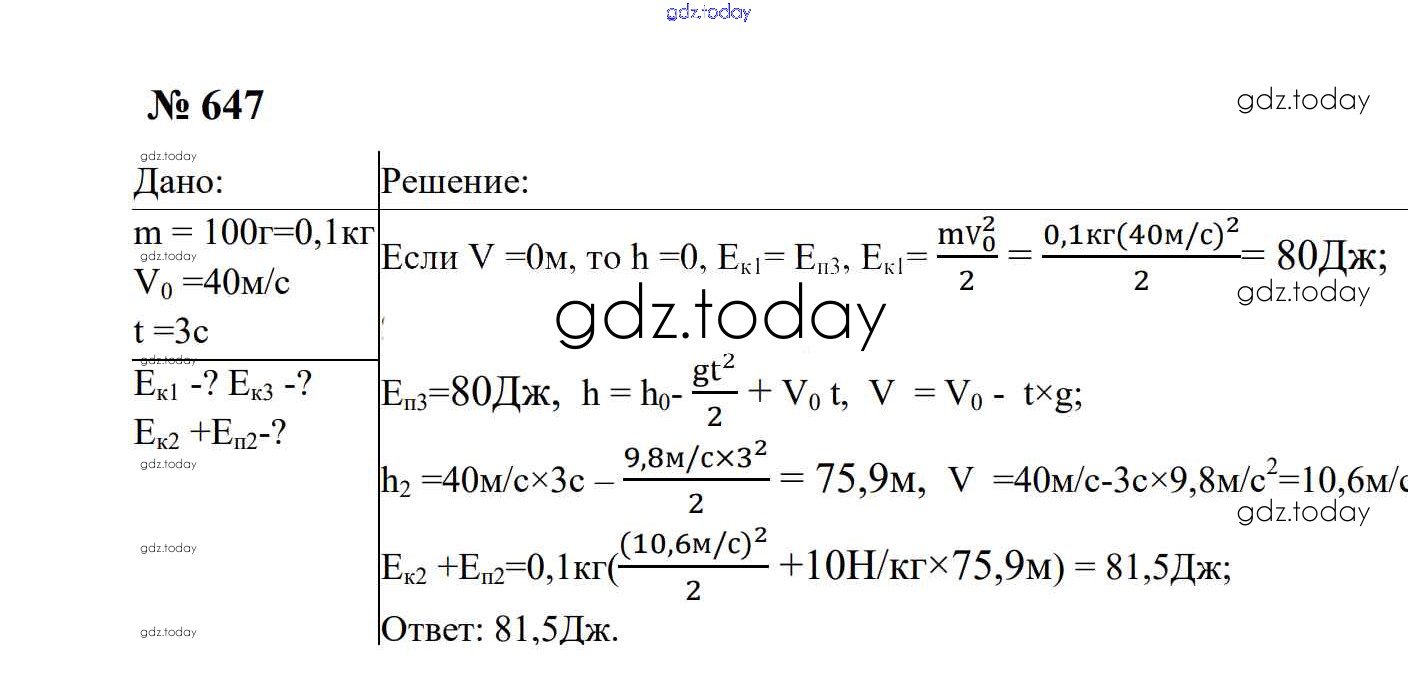 На страницах сайта gdz.today вы найдете учебный и вспомогательный материал, направленный на улучшения знаний школьной программы. ГДЗ - онлайн мир знаний Работа и мощность. Энергия Решение. 7 класс 647 Сборнику задач по Физике для 7-9 класса Перышкин, Лонцова Экзамен УМК 2016