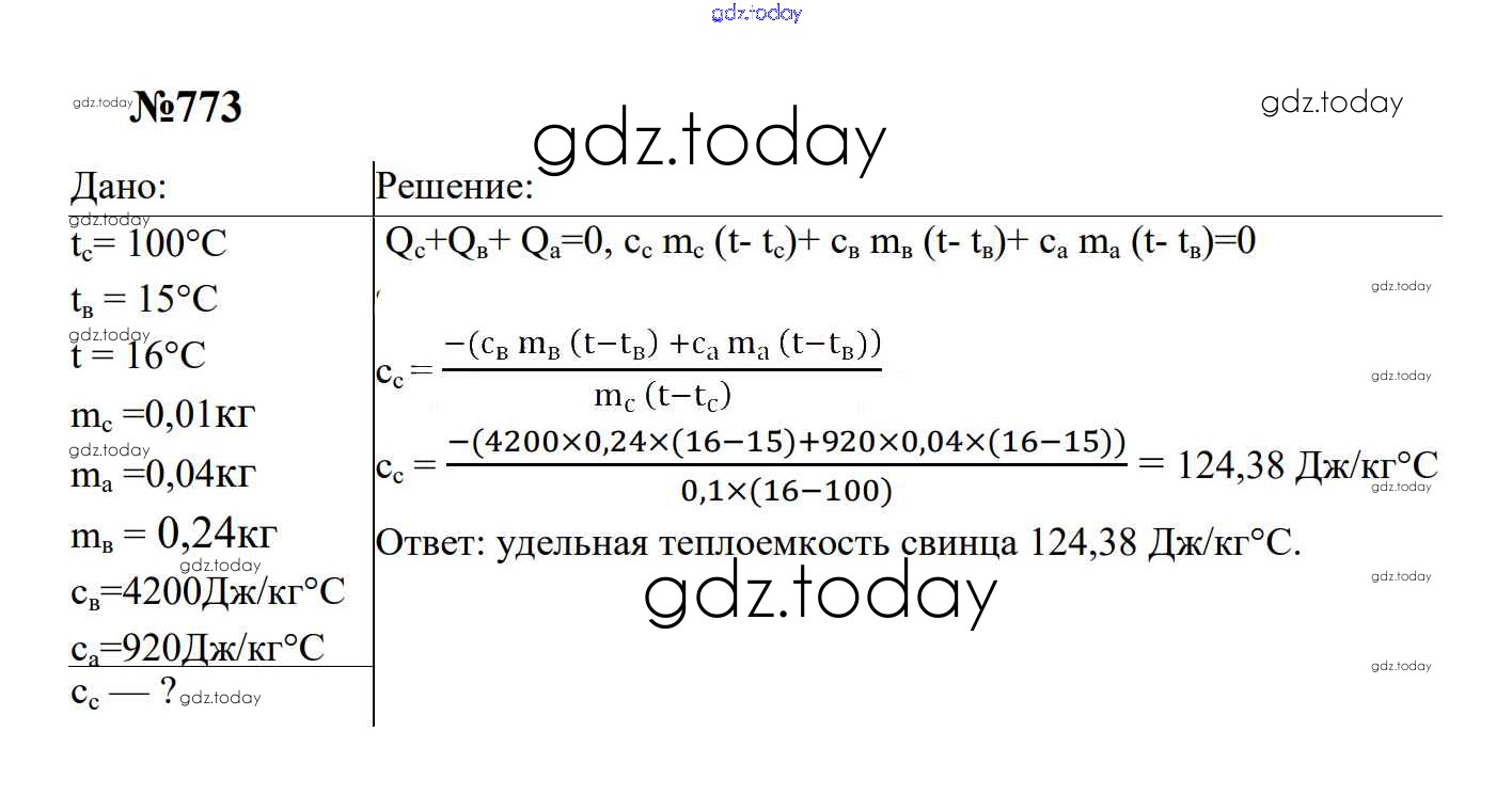 Ответы к Тепловые явления Решение. 8 класс 773 Сборнику задач по Физике для 7-9 класса Перышкин, Лонцова Экзамен УМК 2016