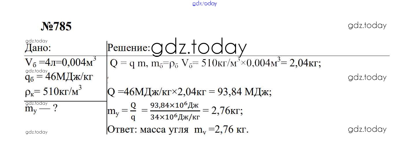 Ответы к Тепловые явления Решение. 8 класс 785 Сборнику задач по Физике для 7-9 класса Перышкин, Лонцова Экзамен УМК 2016