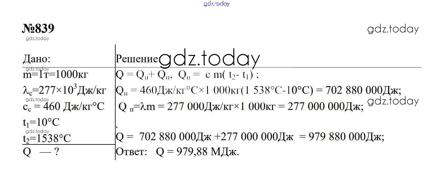 Ответы к Тепловые явления Решение. 8 класс 839 Сборнику задач по Физике для 7-9 класса Перышкин, Лонцова Экзамен УМК 2016