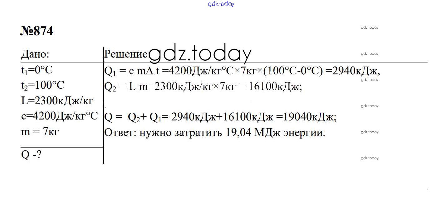 Ответы к Тепловые явления Решение. 8 класс 874 Сборнику задач по Физике для 7-9 класса Перышкин, Лонцова Экзамен УМК 2016