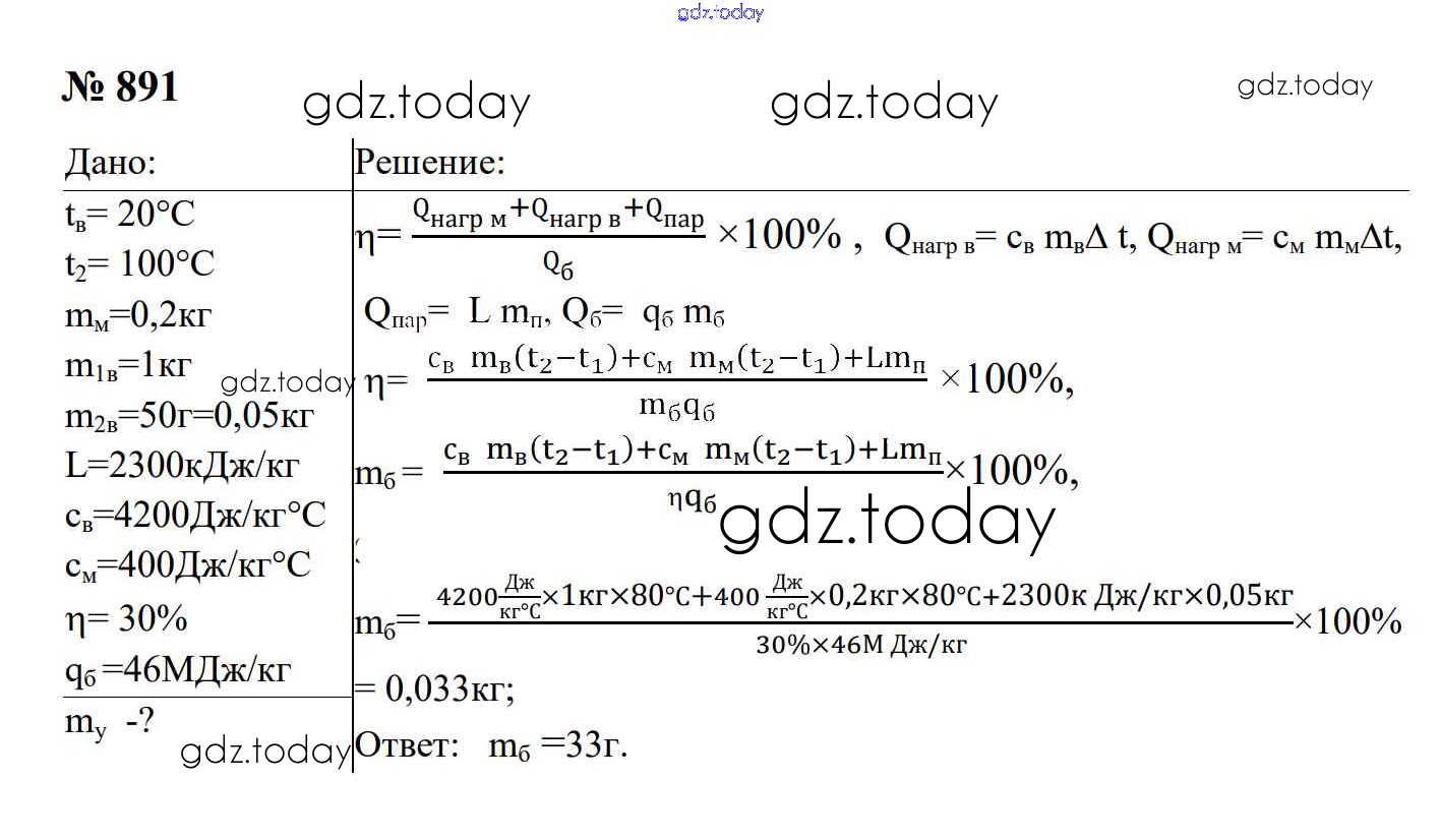 Ответы к Тепловые явления Решение. 8 класс 891 Сборнику задач по Физике для 7-9 класса Перышкин, Лонцова Экзамен УМК 2016