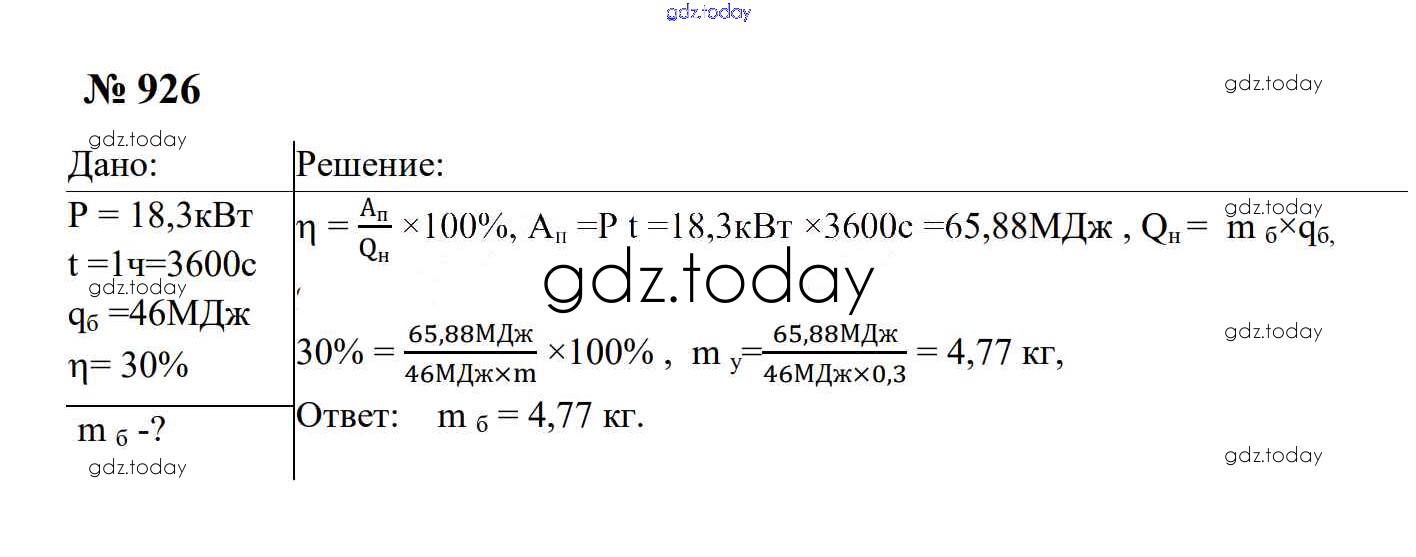Ответы к Тепловые явления Решение. 8 класс 926 Сборнику задач по Физике для 7-9 класса Перышкин, Лонцова Экзамен УМК 2016