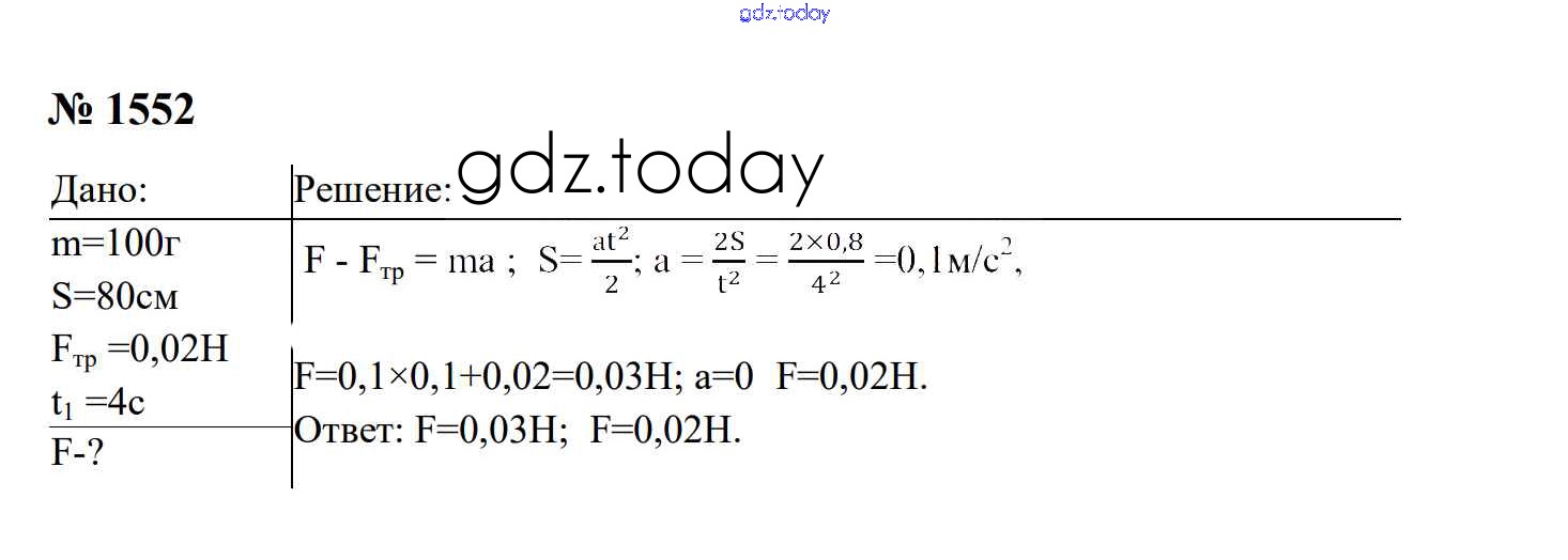 На страницах сайта gdz.today вы найдете учебный и вспомогательный материал, направленный на улучшения знаний школьной программы. ГДЗ - онлайн мир знаний Законы взаимодействия и движения тел Решение. 9 класс 1552 Сборнику задач по Физике для 7-9 класса Перышкин, Лонцова Экзамен УМК 2016