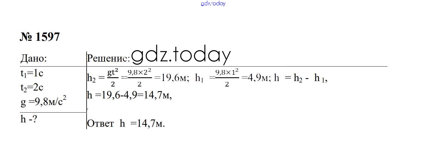 На страницах сайта gdz.today вы найдете учебный и вспомогательный материал, направленный на улучшения знаний школьной программы. ГДЗ - онлайн мир знаний Законы взаимодействия и движения тел Решение. 9 класс 1597 Сборнику задач по Физике для 7-9 класса Перышкин, Лонцова Экзамен УМК 2016