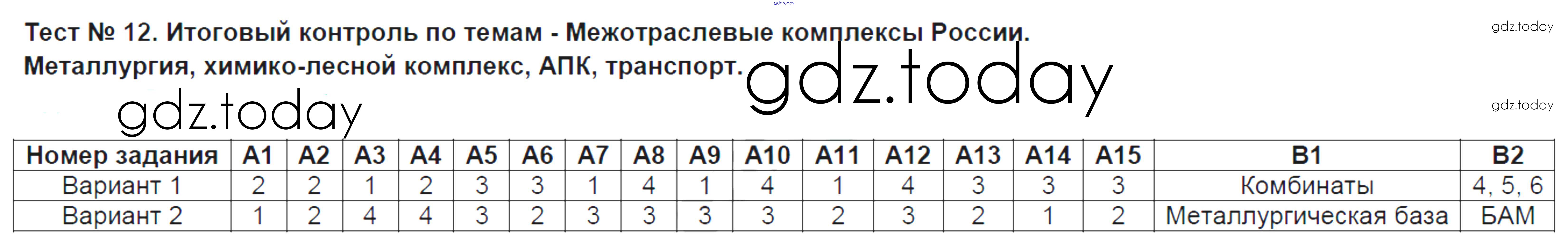 Ответы к Решение к тестам Тест №12. Итоговый контроль по темам - Межотраслевые комплексы России Контрольно-измерительным материалам (КИМ) по Географии для 9 класса Жижина ВАКО 2017