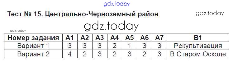 На страницах сайта gdz.today вы найдете учебный и вспомогательный материал, направленный на улучшения знаний школьной программы. ГДЗ - онлайн мир знаний Решение к тестам Тест №15. Центрально-Черноземный район Контрольно-измерительным материалам (КИМ) по Географии для 9 класса Жижина ВАКО 2017