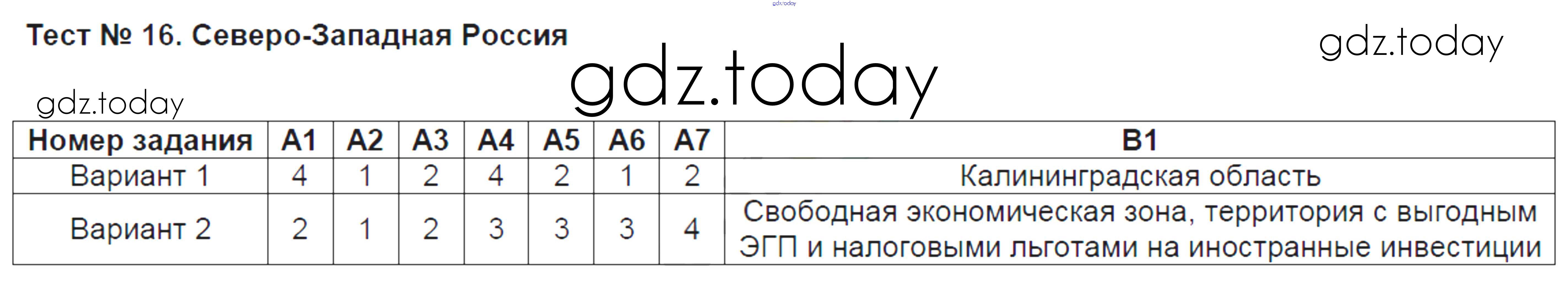 На страницах сайта gdz.today вы найдете учебный и вспомогательный материал, направленный на улучшения знаний школьной программы. ГДЗ - онлайн мир знаний Решение к тестам Тест №16. Северо-Западная Россия Контрольно-измерительным материалам (КИМ) по Географии для 9 класса Жижина ВАКО 2017
