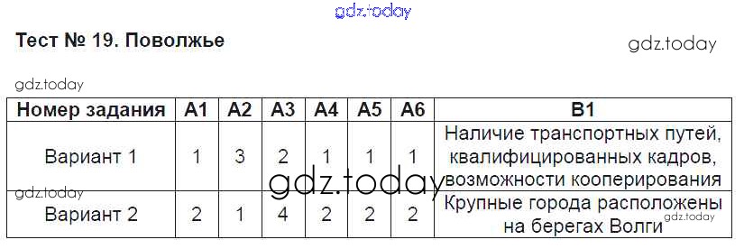 На страницах сайта gdz.today вы найдете учебный и вспомогательный материал, направленный на улучшения знаний школьной программы. ГДЗ - онлайн мир знаний Решение к тестам Тест №19. Поволжье Контрольно-измерительным материалам (КИМ) по Географии для 9 класса Жижина ВАКО 2017