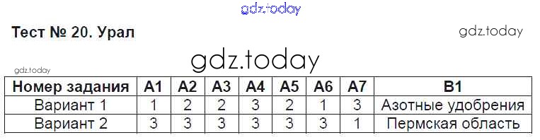 На страницах сайта gdz.today вы найдете учебный и вспомогательный материал, направленный на улучшения знаний школьной программы. ГДЗ - онлайн мир знаний Решение к тестам Тест №20. Урал Контрольно-измерительным материалам (КИМ) по Географии для 9 класса Жижина ВАКО 2017