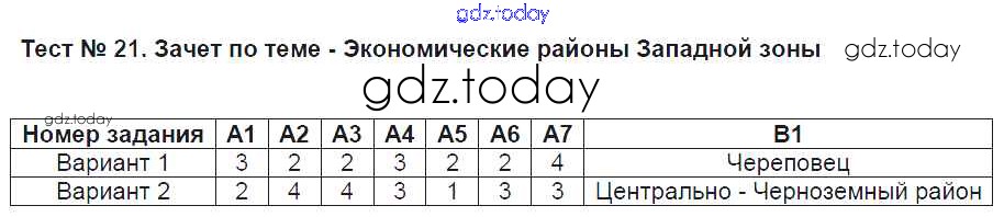 Ответы к Решение к тестам Тест №21. Зачет по теме - Экономические районы Западной зоны Контрольно-измерительным материалам (КИМ) по Географии для 9 класса Жижина ВАКО 2017