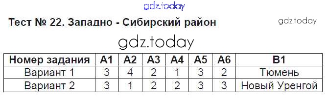 Ответы к Решение к тестам Тест №22. Западно-Сибирский район Контрольно-измерительным материалам (КИМ) по Географии для 9 класса Жижина ВАКО 2017