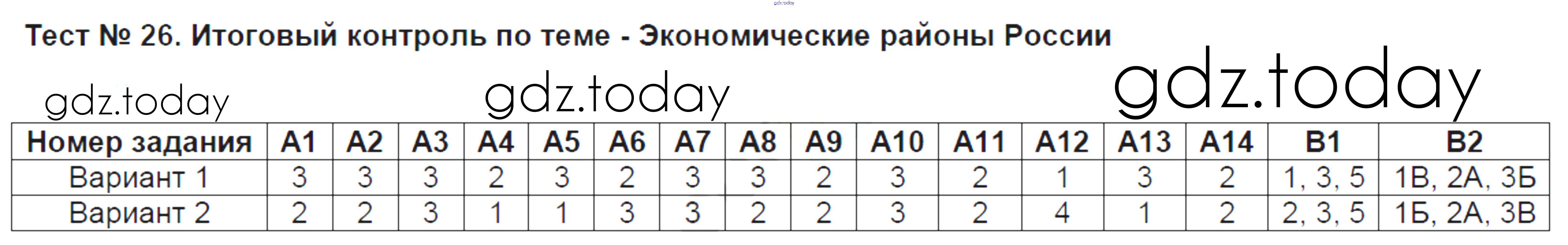 На страницах сайта gdz.today вы найдете учебный и вспомогательный материал, направленный на улучшения знаний школьной программы. ГДЗ - онлайн мир знаний Решение к тестам Тест №26. Итоговый контроль по теме - Экономические районы России Контрольно-измерительным материалам (КИМ) по Географии для 9 класса Жижина ВАКО 2017