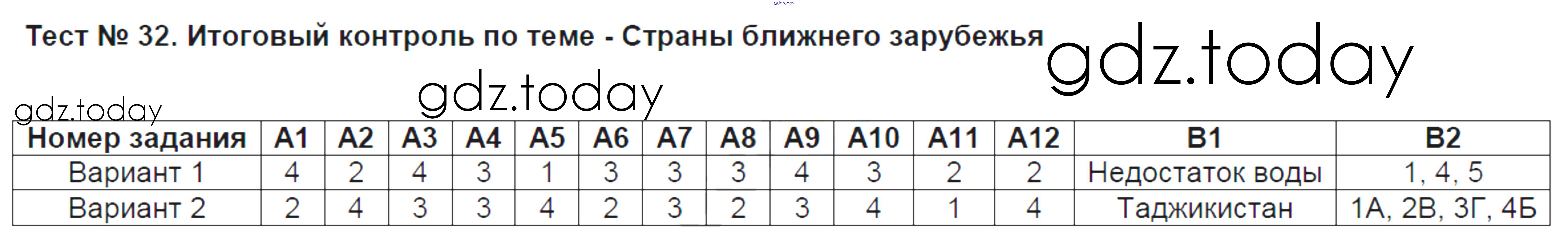 На страницах сайта gdz.today вы найдете учебный и вспомогательный материал, направленный на улучшения знаний школьной программы. ГДЗ - онлайн мир знаний Решение к тестам Тест №32. Итоговый контроль по теме - Страны ближнего зарубежья Контрольно-измерительным материалам (КИМ) по Географии для 9 класса Жижина ВАКО 2017