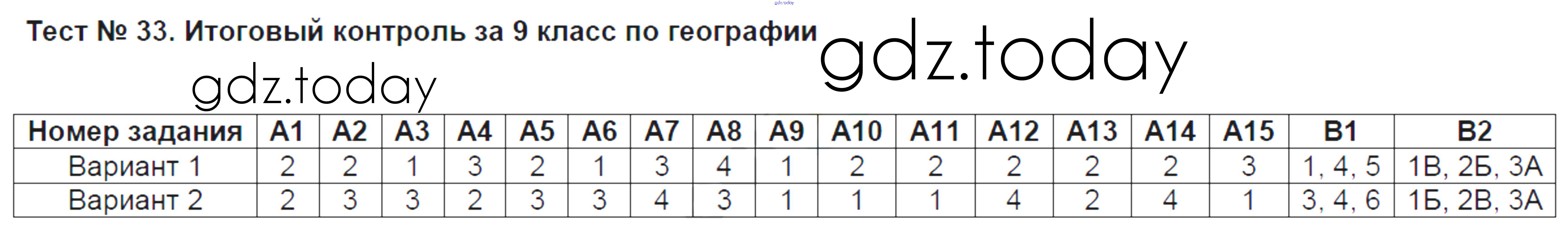 Ответы к Решение к тестам Тест №33. Итоговый контроль за 9 класс по географии Контрольно-измерительным материалам (КИМ) по Географии для 9 класса Жижина ВАКО 2017