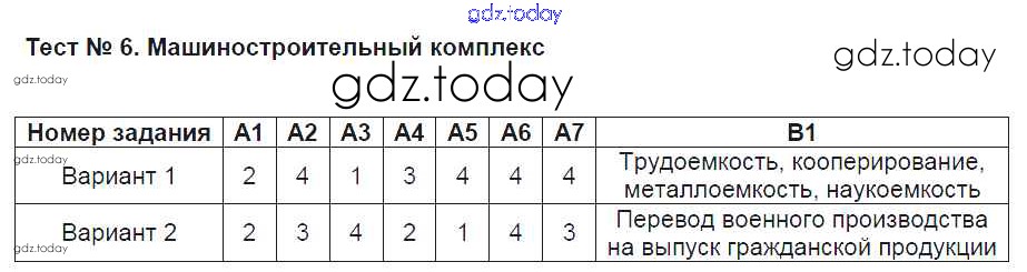 На страницах сайта gdz.today вы найдете учебный и вспомогательный материал, направленный на улучшения знаний школьной программы. ГДЗ - онлайн мир знаний Решение к тестам Тест №6. Машиностроительный комплекс Контрольно-измерительным материалам (КИМ) по Географии для 9 класса Жижина ВАКО 2017