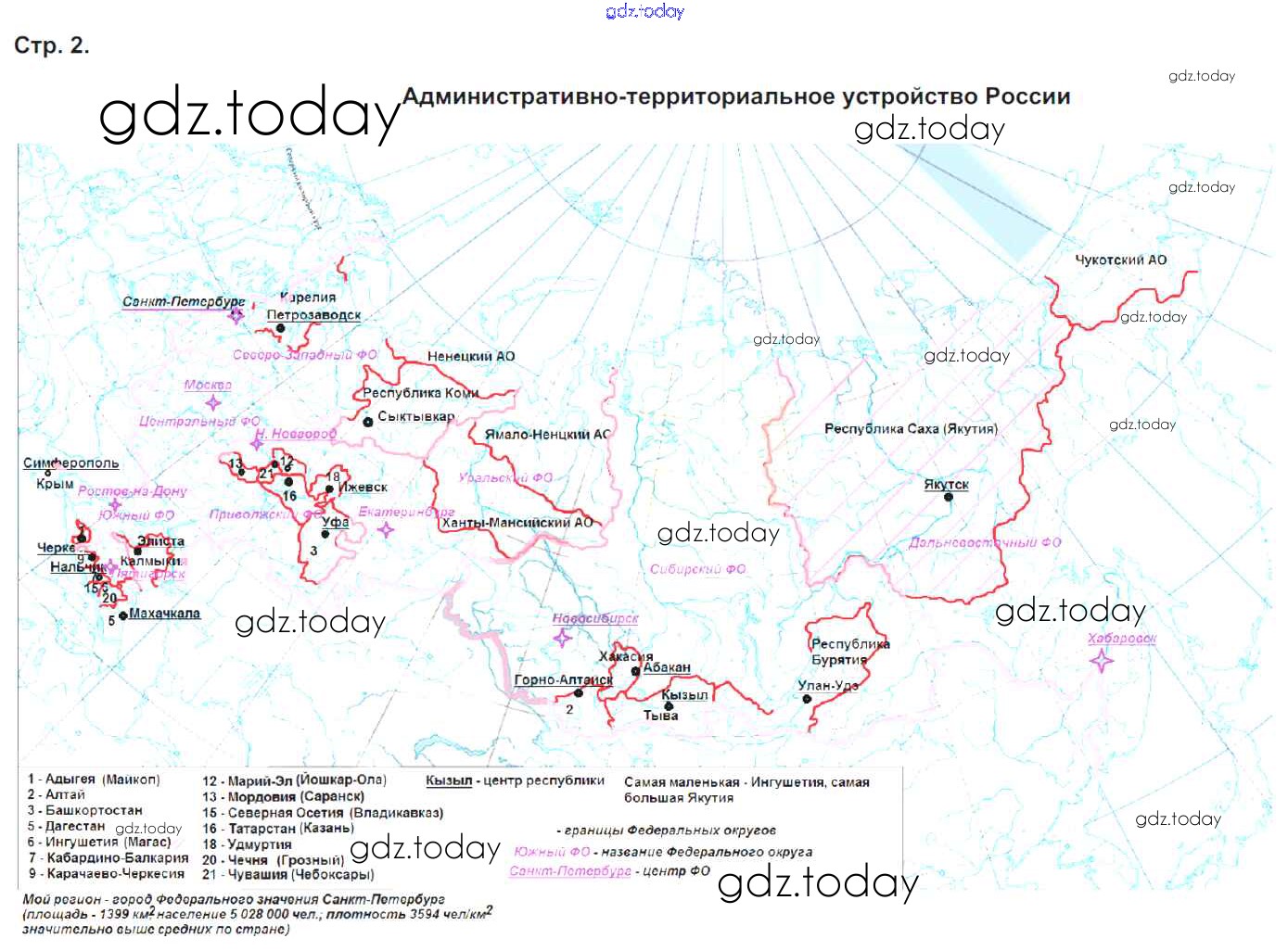 На страницах сайта gdz.today вы найдете учебный и вспомогательный материал, направленный на улучшения знаний школьной программы. ГДЗ - онлайн мир знаний Страницы (решение) стр.2. Административно-территориальное устройство России Контурным картам по Географии для 9 класса Приваловский Дрофа 2020