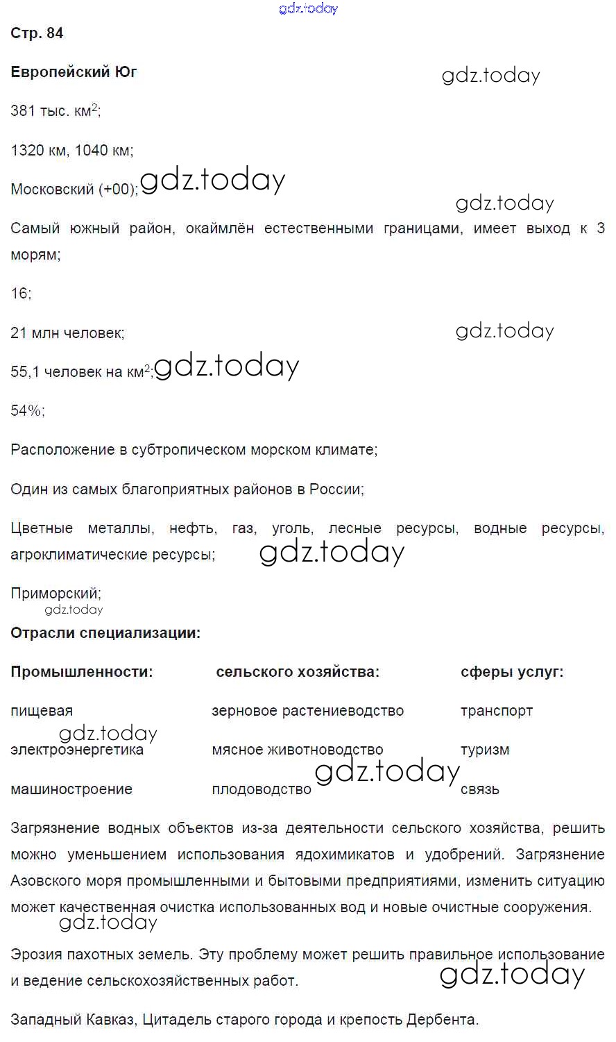 На страницах сайта gdz.today вы найдете учебный и вспомогательный материал, направленный на улучшения знаний школьной программы. ГДЗ - онлайн мир знаний Страницы (решение) 84 Рабочей тетради по Географии для 9 класса Баринова, Дронов Дрофа Вертикаль 2016